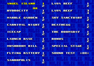 Aller dans le menu des options et jouer les sons 01 , 01 , 02 , 04. La dernière musique jouée en 04 (Oil Ocean Zone) restera où que vous alliez et quoi que vous fassiez ! Remarque : ce code a été découvert en essayant celui du Debug Mode dans les options au lieu du Select Round. Il n'est valable que sur une console NTSC. |