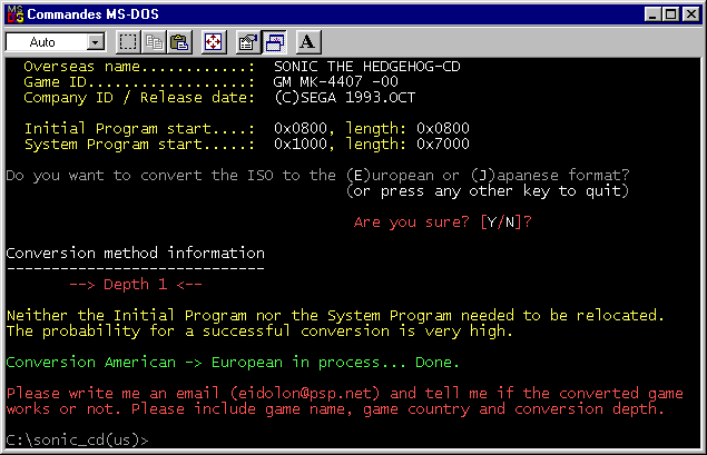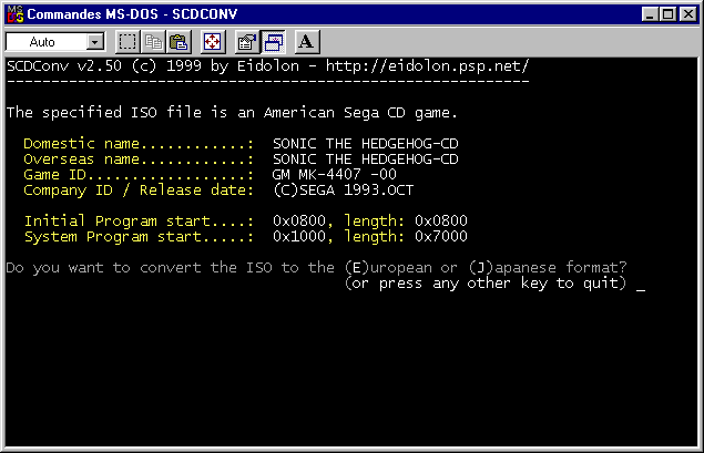 Dans l'exemple suivant, ce sera Sonic CD version US qui sera converti en version EUR.