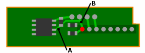 Dans un premier temps, vous allez couper le plus proprement possible la piste au point A avec votre cutter. Cette première modification va stopper l'alimentation du composant et le rendre inactif. Assurez-vous que la coupure est bien faite, utilisez éventuellement un testeur de continuité pour vérifier...