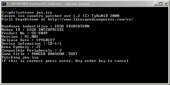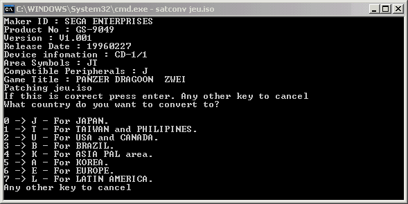 Si tout s'est bien passé, SATConv vous confirme la conversion ("Patch complete"). Pour vérifier que la conversion a bien été effectuée correctement, vous pouvez utiliser la commande SATCONV jeu.ISO -d pour afficher les informations de l'entête uniquement (dans le cas du jeu dans l'exemple, il est alors indiqué "ET" à la place de "JT", pour Europe + Taïwan).