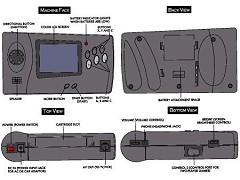 | E/S | 1 slot cartouche 64 broches sortie Audio/Vidéo mini DIN 9 broches (audio mono/stéréo) 1 fiche jack audio stéréo 1 port manette DB-9 pour Player 2 control pad intégré - 8 boutons d'actions - 1 pavé directionnel |
