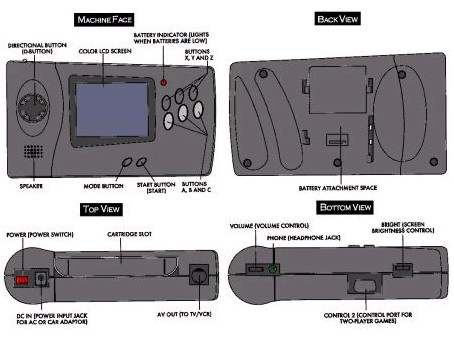 | Affichage | Ecran LCD 3.25'' couleur rétro-éclairé Résolution 320x224 NTSC Video Display Processor (VDP) - Palette de 512 couleurs, dont 64 affichable simultannément (16 x 4 plans) - 80 sprites max (de 8x8 à 32x32) - 2 plans de scrolling + 1 plan pour les sprites |
