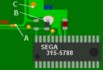 Important : Je vous conseille vivement d'avoir un testeur de continuité (un multimètre par exemple) à porté de main pour tester que le point B est bien isolé ! Si l'isolation n'est pas correcte, en basculant l'interrupteur sur le potentiel opposé à celui d'origine, un court-circuit 0V/+5V est réalisé et peut être fatal à la console !!! N'hésitez pas à creuser avec le cutter dans l'époxy pour vous assurer que la coupure est bien faite et qu'il ne reste pas de cuivre !