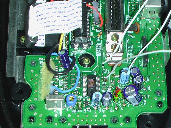 Le point B indique la patte de la résistance R43 soudée et reliée à la masse par 2 bouts de piste. Vous allez devoir couper ces 2 bouts au raz du point B sans l'abîmer car on s'en sert après pour souder dessus (!) et retirer du cuivre (sous le vernis) de la grosse zone 0V se trouvant autour afin d'éviter tout contact avec le fil qu'on viendra souder par la suite... Un bon cutter bien pointu et de la minutie sont requis pour éviter tout dérapage qui serait fatal aux petites pistes et aux petits composants autour ! |