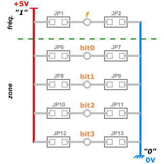Pour chaque couple de jumpers, selon si c'est un jumper ou l'autre qui est "sélectionné", on applique la valeur logique "0" ou "1" au bit d'état associé, comme l'expose le schéma ci-dessous :