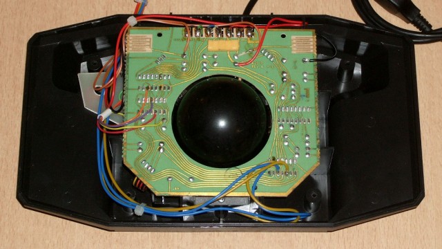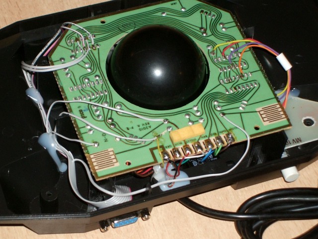 Si votre trackball ne présente pas la petite carte électronique blanche en haut à gauche sur la photo, c'est normal, il s'agit ici d'une modification permettant d'élargir la compatibilité de l'accessoire avec d'avantage de système Atari. De même, on peut voir ci-dessus que le bouton de droite a été déjà scindé, et renvoyé (fil jaune) sur la broche 9 du connecteur "DB-9".