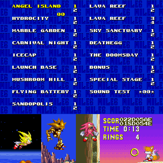 Remarque : les coordonnées hexadécimales de Sonic s'affichent à la place du score que lorsque Sonic est transformé en objet. Si vous êtes déjà dans une partie et que la manipulation pour le Debug Mode normal a été effectué mais que vous n'avez pas choisi le niveau avec A + START ou que vous êtes passé par le menu "1 PLAYER" : Remarque : cette manipulation est aussi possible en fin de zone (pas en fin d'act). Si vous êtes déjà dans une partie et que la manipulation pour le Debug Mode normal a été effectué mais que vous voulez passer par le menu "1 PLAYER" :