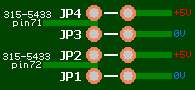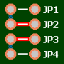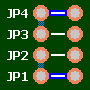 Les jumpers fonctionnent par paire (JP1 + JP2 et JP3 + JP4) et permettent de sélectionner une configuration où une autre, exactement comme ceux sur la carte mère d'un ordinateur par exemple, à l'exception près qu'il n'y a pas de support pour les cavaliers (cavalier = jumper) puisque c'est une piste électronique qui réalise le contact. Voici ce que cela donnerait si ce support était présent :
