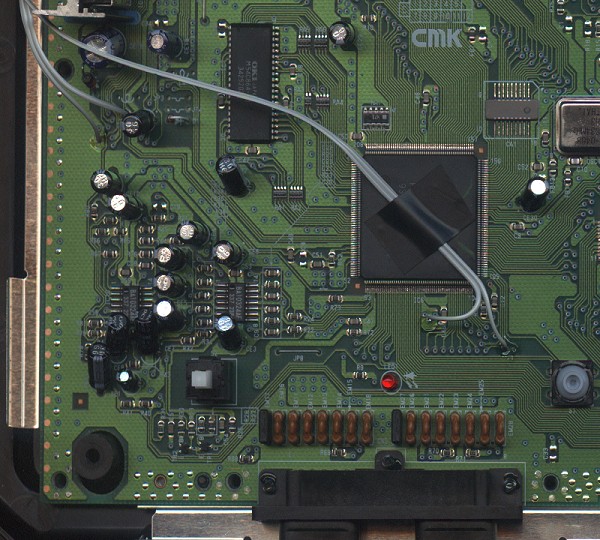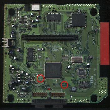 La modification va donc consister à isoler ces 2 broches de leur potentiel actuel qui impose la configuration de la console et à envoyer des fils connectés à ces broches vers des interrupteurs sur lesquels les potentiels 0V et +5V seront aussi envoyés il va de soit. Pour "envoyer" ces fils il va donc falloir trouver des endroits adéquates sur la carte mère pour souder tout cela...