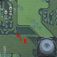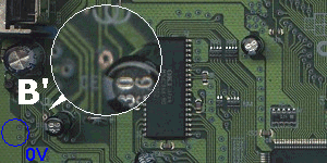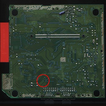 Note : sur une console NTSC (japonaise ou américaine), le petit morceau de piste à couper se trouve juste à côté et relie la piste à l'autre groupe de pads à droite (potentiel +5V).