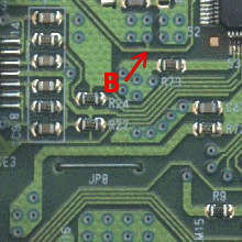 Pour ce faire, dans le cas de la broche 46, il va seulement falloir couper au cutter le tout petit morceau de piste au point B qui la relie au 0V comme ci-contre >