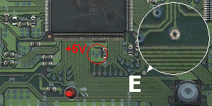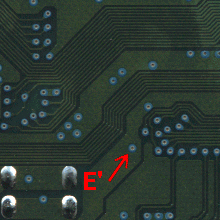 Au point E, la piste venant de la broche 107 arrive sur un trou conducteur qui débouche de l'autre côté de la carte au point E' et est directement connecté au potentiel +5V.