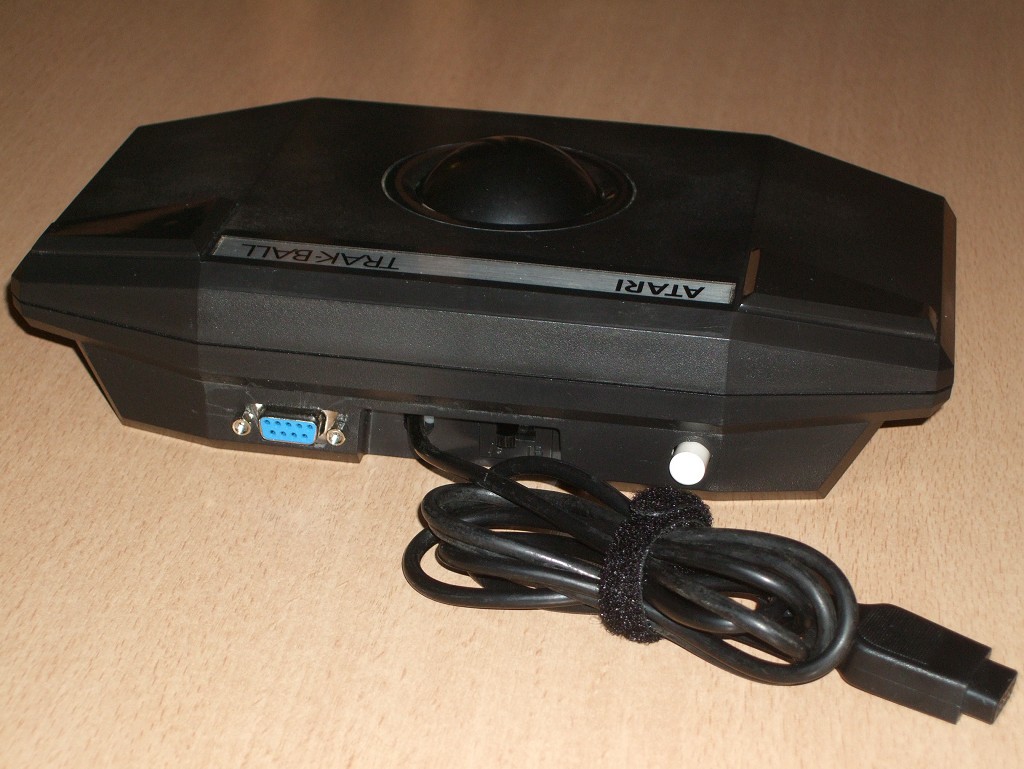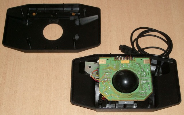 Si votre trackball ne présente pas la petite carte électronique blanche en haut à gauche sur la photo, c'est normal, il s'agit ici d'une modification permettant d'élargir la compatibilité de l'accessoire avec d'avantage de système Atari. De même, on peut voir ci-dessus que le bouton de droite a été déjà scindé, et renvoyé (fil jaune) sur la broche 9 du connecteur "DB-9".