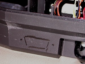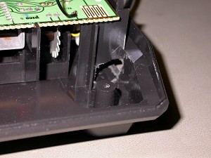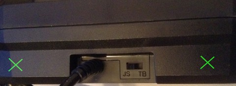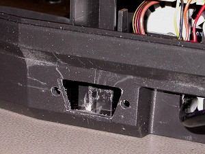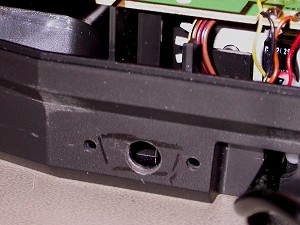 | « cas 1 » : | réalisez un perçage à la même hauteur que celui par lequel passe le câble actuel, d'un côté ou de l'autre du trackball (le côté gauche, sur la photo ci-dessous, est préférable au vu de ce qui suit), pour faire passer les fils, ou le nouveau câble ; il y a amplement la place : |