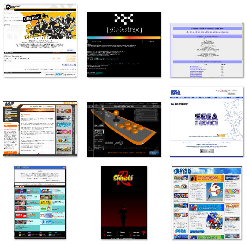 J'ai donc profité de l'occasion pour me re-pencher sur la section "Sauvegarde", avec une mise au propre de son index (fini l'arborescence de dossiers basique - la section "Jouez !" devrait d'ailleurs subir prochainement un traitement similaire), et surtout un ajout majeur de 9 sites/portails, ainsi que de nombreux sous-sites/sites dédiés de jeux, qui rejoignent ceux de SegaHard (qui, après avoir disparu il y a 4 ans, est depuis de nouveau disponible officiellement) et Sega Swirl ; un ajout de 3.5Go, tout de même, qui comprend notamment la majeur partie des fichiers médias, et autres goodies à télécharger !